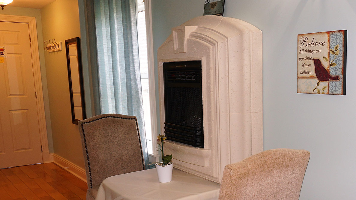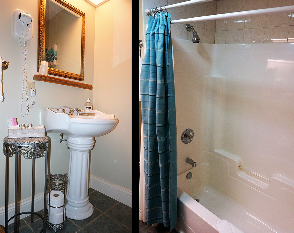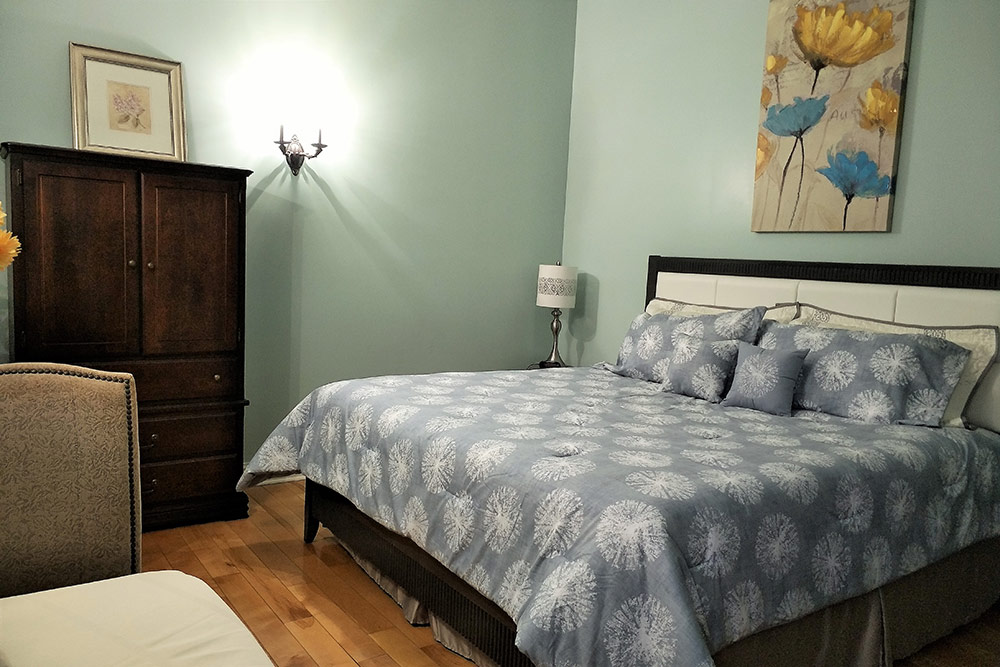 A charming room for a family vacation or a romantic getaway/honeymoon spot. Located on the second level without a water view. Features: King bed (can be repurposed as two twin beds), queen desk bed (folds from bed to functional desk), cast fireplace, flat-panel TV, hardwood floor, en-suite bath with shower/tub. Colour scheme: taupe, brick, red, green.